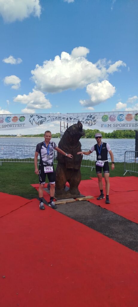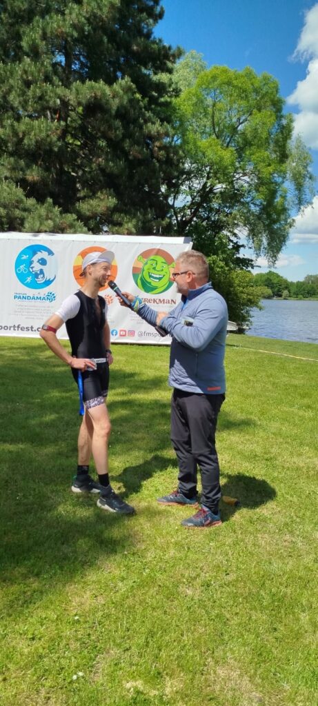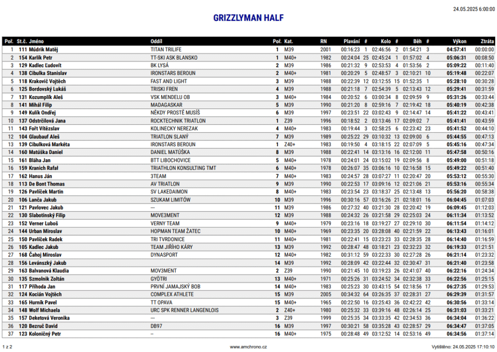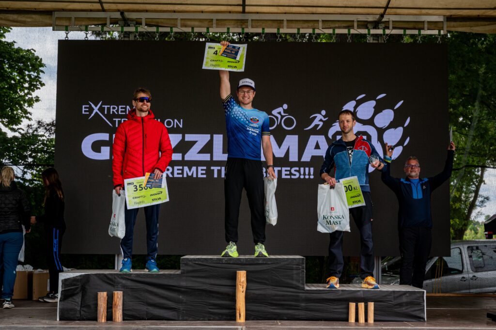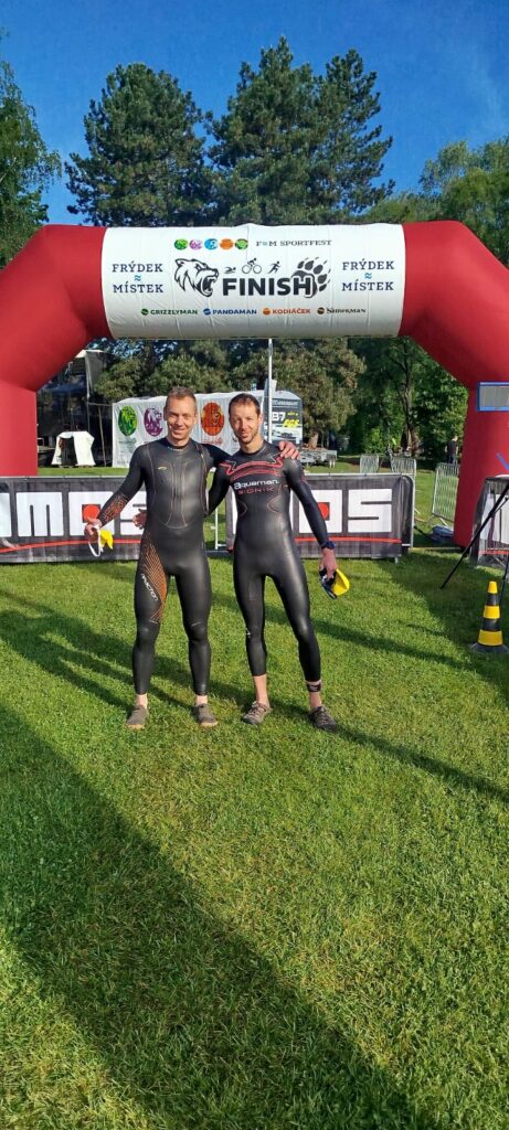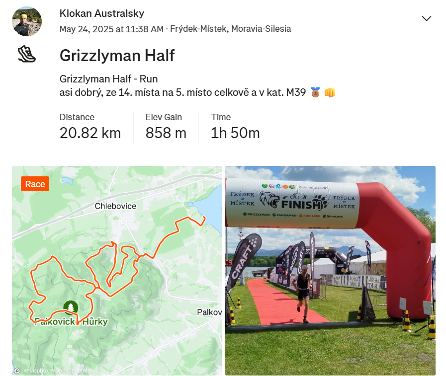 Po delších osamocených úsecích mě pokaždé nakoplo zahlédnout někoho přede mnou. V nástupu do poslední stojky na Ostružnou jsem kousek pod vrcholem zahlédl pohyb dvou osob a zahájil finální stíhačku. V seběhu jsem se posunul a posledního borce jsem předbíhal asi na 18. km. V opačném směru jsme míjeli Petra Vabrouška, který po 2 km plavání a 180 km na kole mířil vstříc prvnímu stoupání běžecké trasy o celkové délce 42 km. Nechtěl bych. Pak už jen na plno držet nastavené tempo až do cíle svého prvního polovičního triatlonu Grizzlyman. Nejrychlejší běh ze všech znamenal celkové 5. místo a třešničkou na dortu bylo 3. místo v kat. M39. Petr Karlík skončil 2. celkově a první v kategorii M40+ 👊