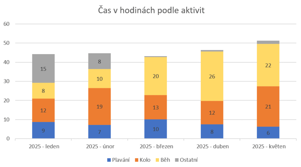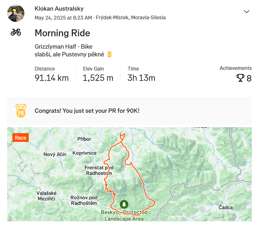 Pro rok 2025 jsem se zaměřil na triatlon a vzhledem ke své trailové minulosti jsem si za hlavní cíl vybral extrémní poloviční triatlon Grizzlyman, který se odehrává v Beskydech. Za organizačním týmem stojí stejná parta lidí, která dělá i více známé extrémní akce jako LH24 nebo Beskydská sedmička. Obou zmíněných akcí jsem se již v minulosti účastnil a Grizzlyman byl v podstatě takovým završením této krásné beskydské trilogie. Závod probíhá koncem května, v podstatě v začátku triatlonové sezóny. Hlavní přípravu jsem zahájil od ledna a najel jsem na trochu jiný režim, než na jaký jsem byl zvyklý. Zaměřil jsem se zejména na objem časových hodin. V zimních měsících to znamenalo hlavně trenažer na kole, ranní plavání v bazénu a občasný běh. Od března jsem pomalu začal zvyšovat objem běhání a zařadil i několik menších testovacích závodů. S postupným oteplováním pak začaly i venkovní švihy na kole. Těch bylo nakonec ale trochu méně, než jsem zamýšlel, zejména kuli chladnému a deštivému květnu. Snažil jsem se držet kolem 10-12 tréninkových hodin týdně. Někdy se podařilo i více. Po třech týdnech jsem vkládal jeden týden s nižším objemem. Volných dní nakonec moc nebylo.